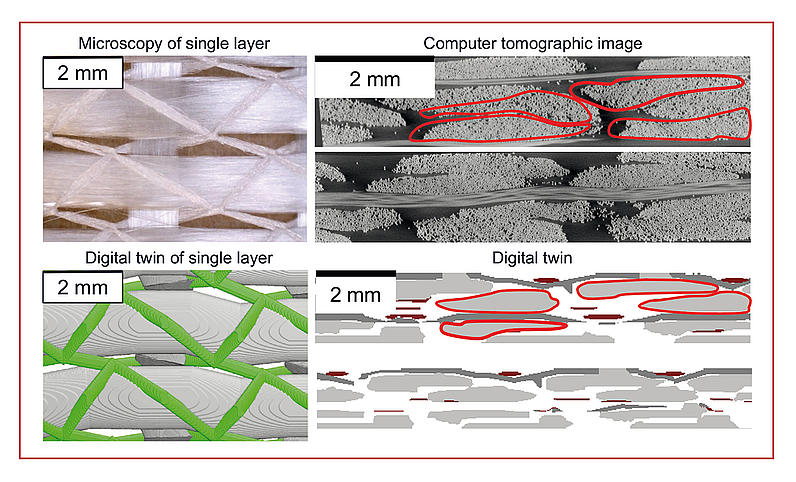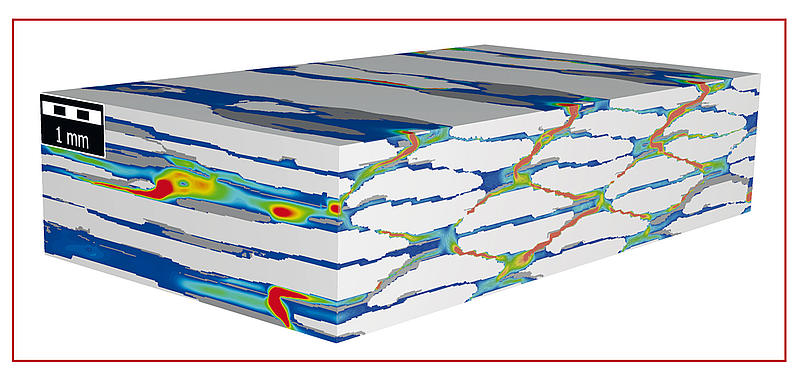In dem Workflow wird zunächst auf Mikroebene die Permeabilität innerhalb der Rovings bestimmt, um diese auf der Mesoebene randomisierten Einzellagen mit soliden Rovings zuzuweisen. Die Einzellagen werden anschließend virtuell gestapelt und kompaktiert, um eine realistische Abbildung von Rovingdeformationen zu erreichen. Die bei 50 % Faservolumengehalt (FVG) kalibrierten digitalen Zwillinge wurden auf 55 % und 60 % FVG weiter kompaktiert. Die Genauigkeit der Simulationsergebnisse liegt, mit maximalen Abweichungen von -35 % bis +42 % zu den Experimenten, in der gleichen Größenordnung wie sie für experimentelle Vergleichsstudien üblich ist. Analog wurde der Workflow zur Bestimmung der mechanischen Eigenschaften des mit Epoxidharz imprägnierten Geleges angewendet. Auf Mesoebene wurde ein Zugversuch sowohl in GeoDict als auch im Labor durchgeführt. So konnten Deformation und Versagen präzise vorhergesagt werden.» weiterlesen» einklappen