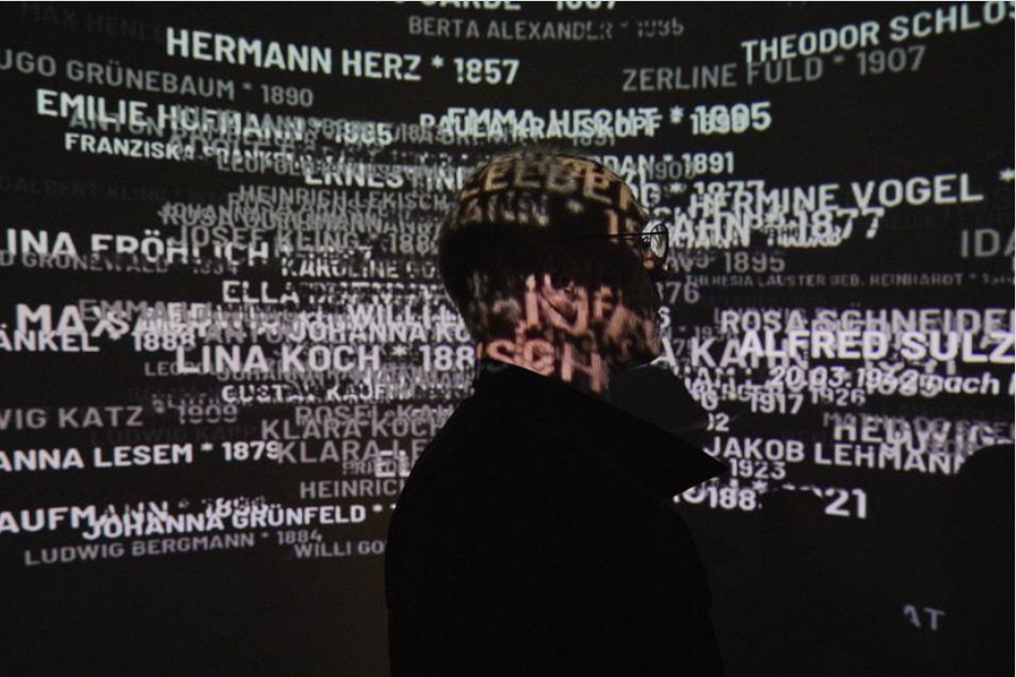Der „Raum der Namen“ ist eine Medieninstallation, die, in einem abgedunkelten Bereich der Ausstellung, die Namen von zwischenzeitlich rund 1.700 durch die NS-Diktatur Deportierten und Ermordeten aus Mainz/Rheinhessen vergegenwärtigt. „Der Raum der Namen, der die Möglichkeit bietet, das damalige Unrecht aufzuarbeiten, ist entsprechend kontemplativ gestaltet“, hebt Prof. Anja Stöffler, eine der beiden Projektleiterinnen, hervor.