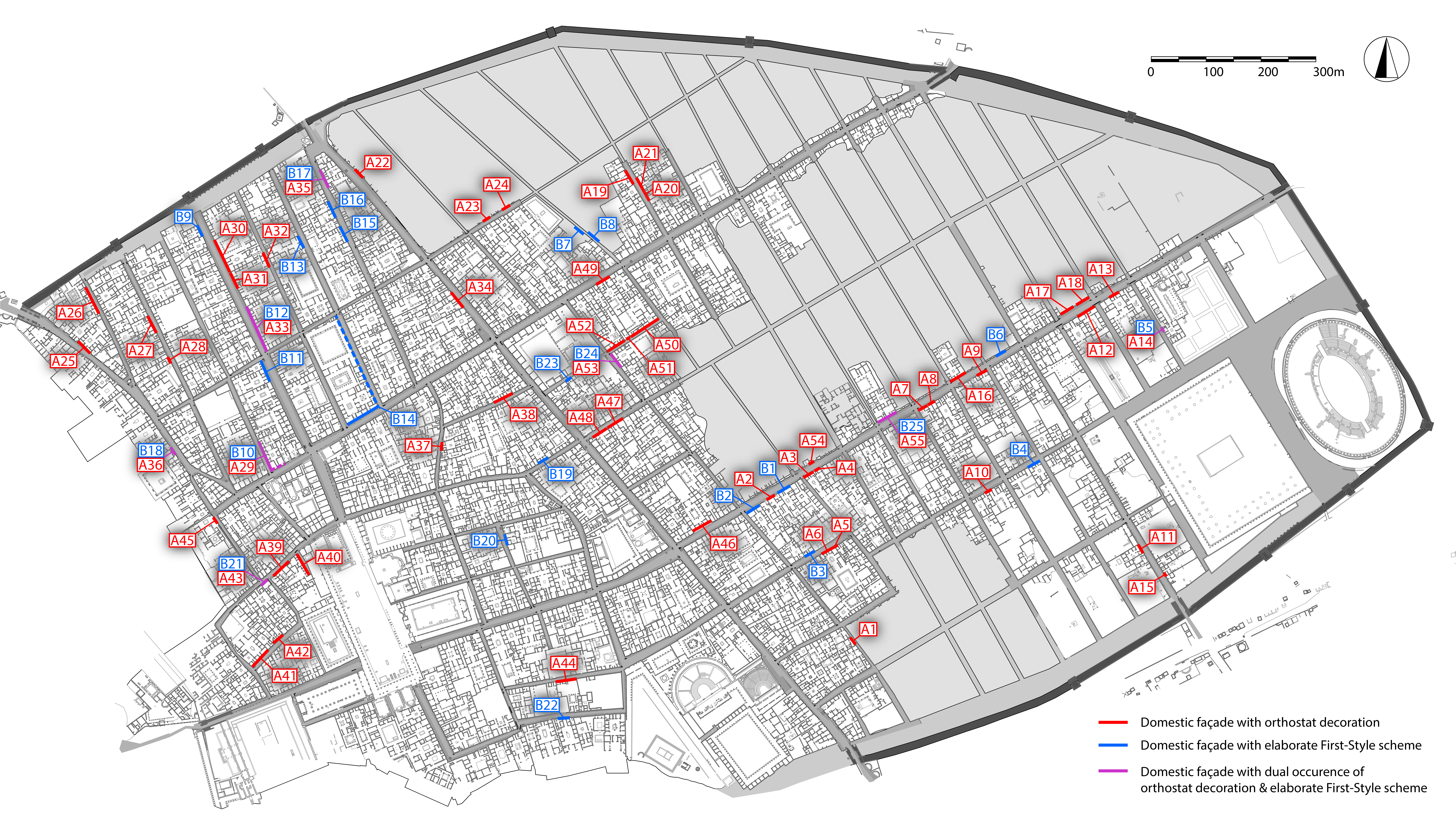 Map of Pompeii giving locations for extant decorative façade schemes listed in catalogues A-B (basemap courtesy of E. Poehler, Pompeii Bibliography and Mapping Project)