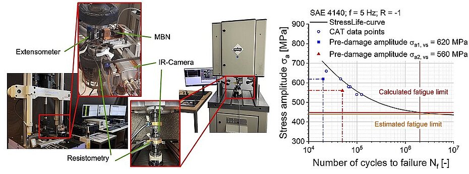 Dieser Charakterisierung folgend wird der geschädigte Bereich an der Probe abgetragen, diese poliert und anschließend an verschiedenen Prüfsystemen mit Versuchsfrequenzen von 5, 60, 200 bzw. 1000 Hz zweitbeansprucht. Die hierbei ablaufenden Prozesse sollen in einem mechanismenorientierten Modell abgebildet werden, um auch die Unterschiede zwischen ungeschädigter und vorgeschädigter Probe beschreiben zu können.