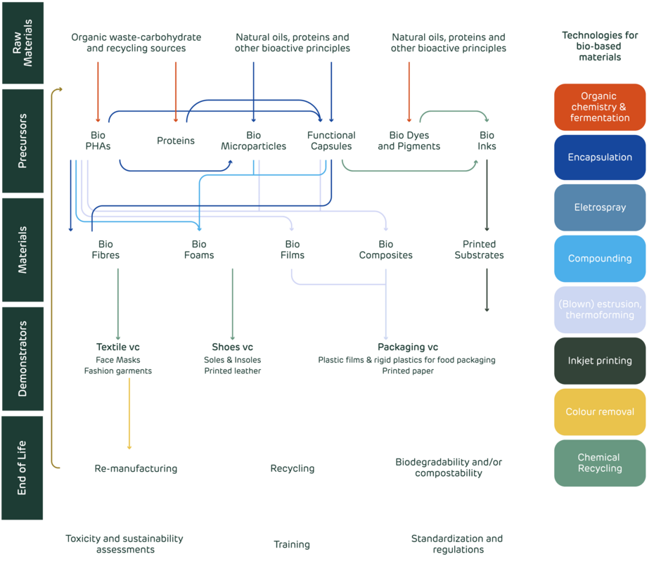 Waste2BioComp project aims to demonstrate relevant scale production of bio-based products and materials, as alternatives to traditional materials with high environmental footprint, using innovative manufacturing technologies. The project integrates all stages in the bio-based products life cycle, starting from R&I activities regarding the sourcing of feedstocks for the development of bio-based precursors and intermediate materials, smart inkjet printing techniques, and smart manufacturing...Waste2BioComp project aims to demonstrate relevant scale production of bio-based products and materials, as alternatives to traditional materials with high environmental footprint, using innovative manufacturing technologies. The project integrates all stages in the bio-based products´ life cycle, starting from R&I activities regarding the sourcing of feedstocks for the development of bio-based precursors and intermediate materials, smart inkjet printing techniques, and smart manufacturing technologies for final products, and the final demonstrators, which will entail the production on a relevant scale of the following bio-based products: shoe sole materials with different hardness; three-layered shoe insoles; plastic films/packaging with different flexibilities; social face masks; fashion garments printed with bio-based inks; leather and textile shoes printed with bio-based inks; paper for packaging printed with bio-based inks. Waste2BioComp will also develop sustainability and toxicity assessments to the developed materials and products, as well as re-manufacturing and recycling approaches to ensure circularity by closing the material loop. Furthermore, the project will develop dedicated training activities to support the creation of a skilled workforce in biomaterial-based manufacturing sectors, particularly for the textile, footwear, and packaging activities. Therefore, Waste2BioComp will have a significative impact on the reduction of the use of fossil-based materials, not only in the approached three value chains (textiles, packaging, and footwear), which are highly resource and polluting intensive sectors, but also with potential for several other sectors and applications. The project will run for 36 months, and it will be constituted by 13 partners from France, Germany, Italy, Portugal, Spain, and Switzerland.» weiterlesen» einklappen